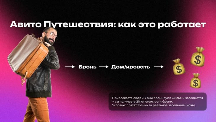 ✅Авито Путешествия — это сервис бронирования жилья посуточно. Не отели, а именно частный сектор: квартиры, дома, апартаменты. По всей России больше 300 тысяч вариантов. Плюс для пользователей — скидки до 30% и бонусы. Для нас, как для вебмастеров, — выплата за заселение.