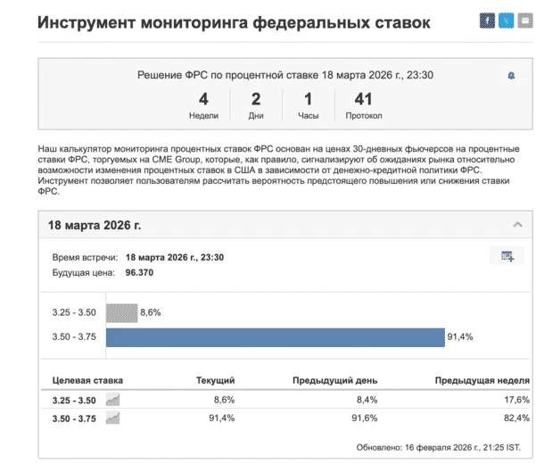 По данным инструмента FedWatch от CME, рынки оценивают вероятность сохранения ставки на уровне 3,50–3,75% в 91,4%, а вероятность снижения ставки более чем на 25 базисных пунктов до июля составляет всего 8,6%. Помним, что высокая ставка держит доллар сильным и ликвидность ограниченной, а значит, рост крипты может быть сдержанным, пока ставка не снизится.
