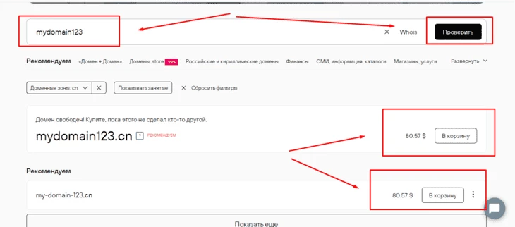 в строке подбора доменного имени введите название и кликните по кнопке проверить. Добавьте домен в корзину;