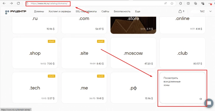 Пролистайте страницу с поиском доменов до конца и кликните по кнопке “Посмотреть все доменные зоны”;
