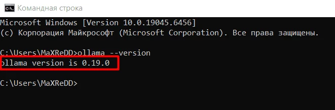 После установки открываем командную строку (СМD) и вводим команду: ollama --version.