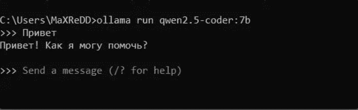 После установки вводим команду: ollama run qwen2.5-coder:7b и проверяем работу нашей нейронки.