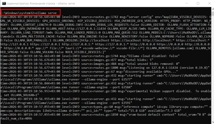 Установили Claude, далее вводим команду ollama serve и запускаем Ollama.