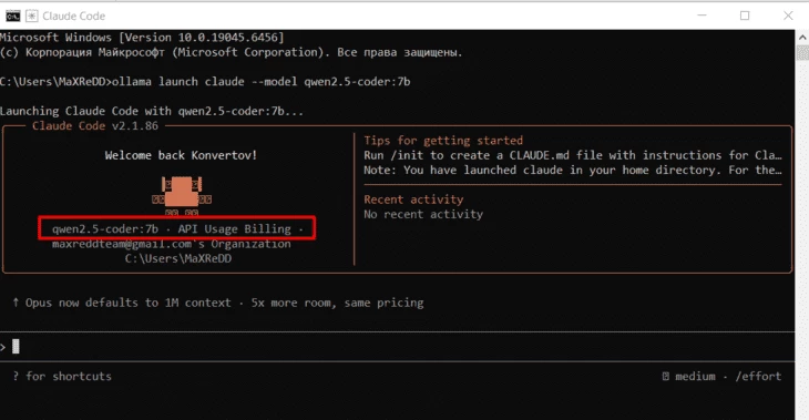 Как видим, все работает. Далее просто в этом же окне вводим команду: ollama launch claude --model qwen2.5-coder:7b.