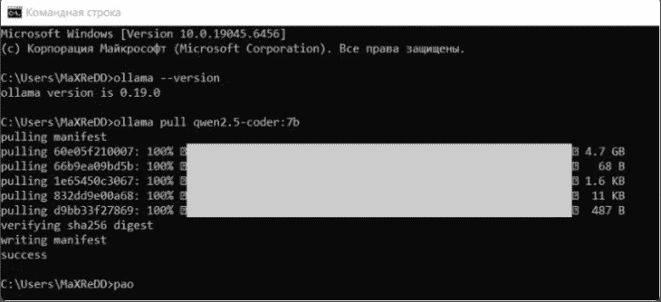Выбираем нужную модель и вводим команду в командной строке: ollama pull qwen2.5-coder:7b. Где «qwen2.5-coder:7br» — название выбранной нами модели.