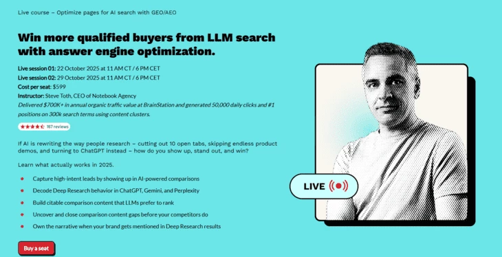 Курс про, как попасть в поисковую выдачу ChatGPT, Perplexity, Gemini и Google AI-поиск. Вам расскажут, как LLM-модели формируют «мнение» и по каким сигналам выбирают, кого цитировать. По сути, учат, как сделать так, чтобы в ответах вроде «топ-3 кешбэк-сервисов с быстрыми выплатами» появлялись именно ваши лендинги.