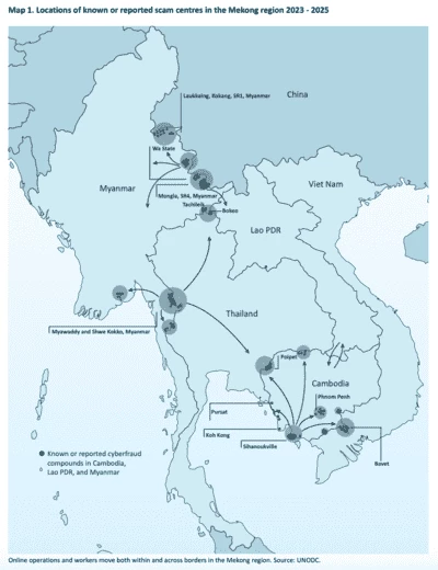 Локации известных мошеннических центров вблизи дельты реки Меконг в 2023–2025 годах. Данные: UNODC.