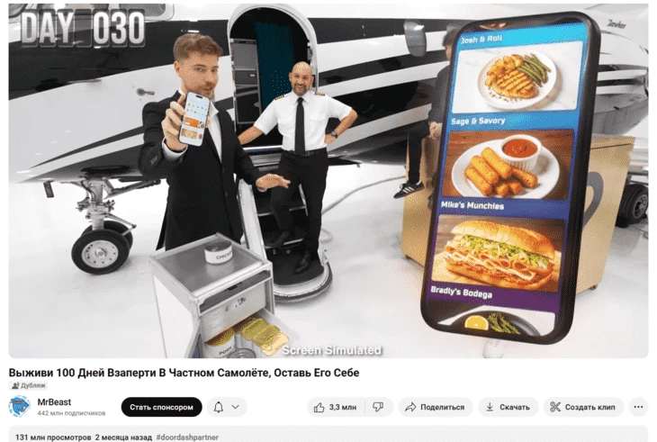 Крупные бренды часто покупают интеграции в контенте MrBeast, в том числе упоминания в роликах или полноценные коллаборации. Чаще всего к нему обращаются американские компании, например, сервисы для доставки еды, маркетплейсы, финансовые инструменты и сервисы.