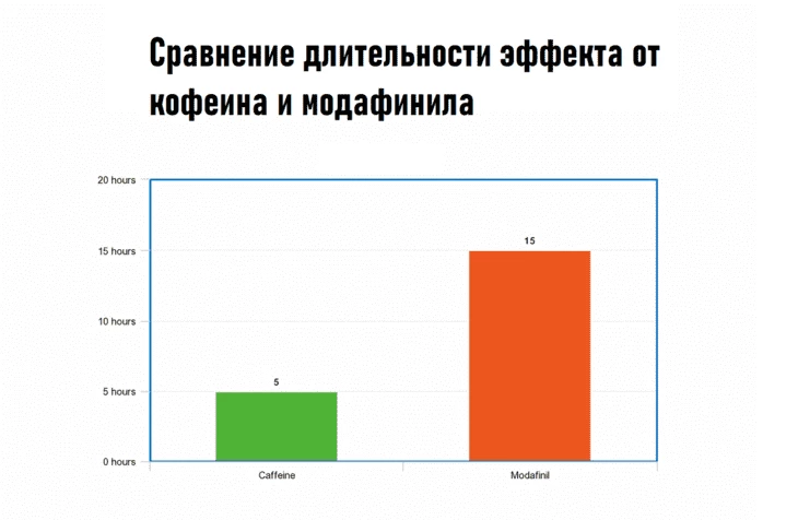 Подавление сонливости. Препарат помогает сохранять бодрость в течение 10–15 часов даже при нехватке сна. При этом эффект длится вплоть до 15 часов, что намного дольше, например, по сравнению с кофеином, который дарит бодрость примерно на 5 часов.