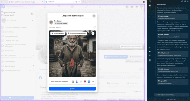 Результат сразу доступен для автоматизации. В этом примере сгенерировали изображения, указали вкладку и задачу. ИИ сам переключился на фанку и загрузил визуал.