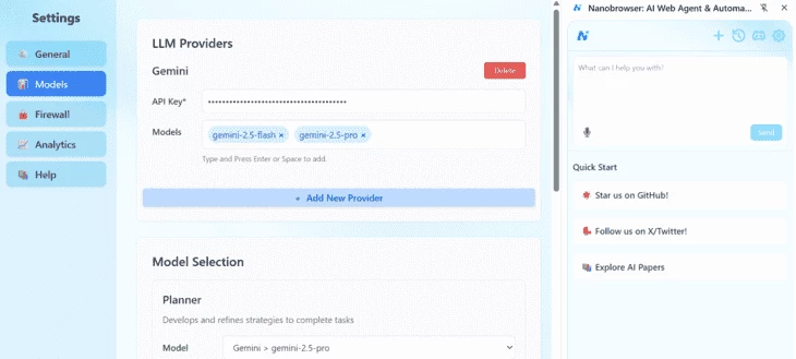 Вначале нужно указать API Key от любого LLM. Можете бесплатно подключить Gemini. Лимиты накладывает только сам LLM, чей ключ установите. Работает медленнее Comet, не хранит контекст, нет истории.