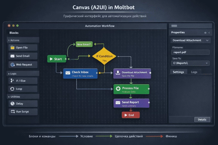 Canvas (A2UI) — это графический рабочий стол для автоматизации процессов. По сути, это визуальная панель, где пользователь может строить последовательность действий бота в виде блок-схемы. Каждый блок представляет собой отдельную команду или операцию. Открыть файл, отправить письмо, выполнить скрипт, обработать данные и многое другое.