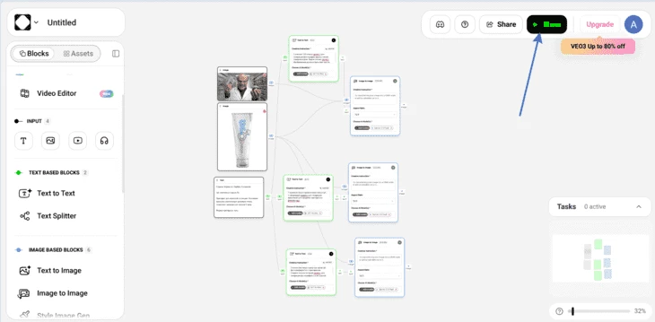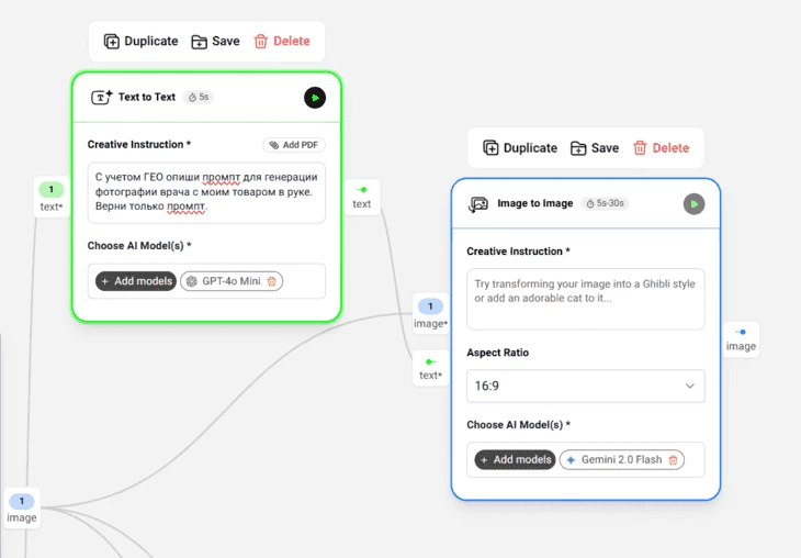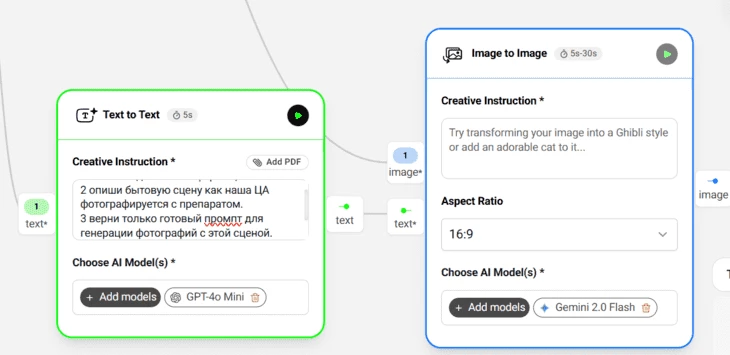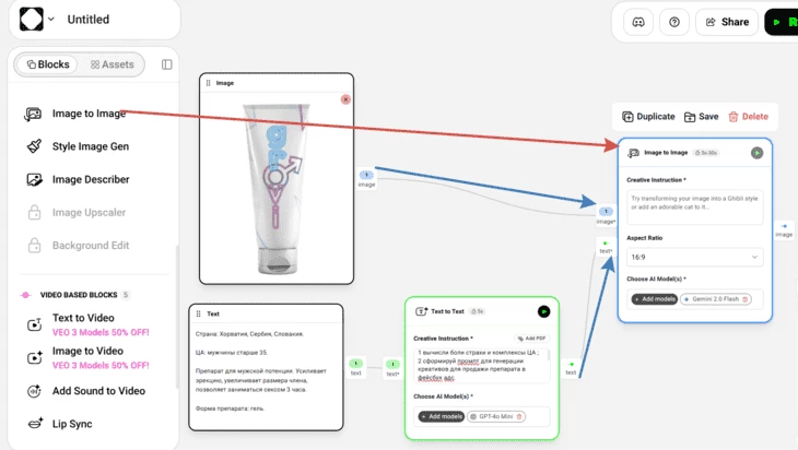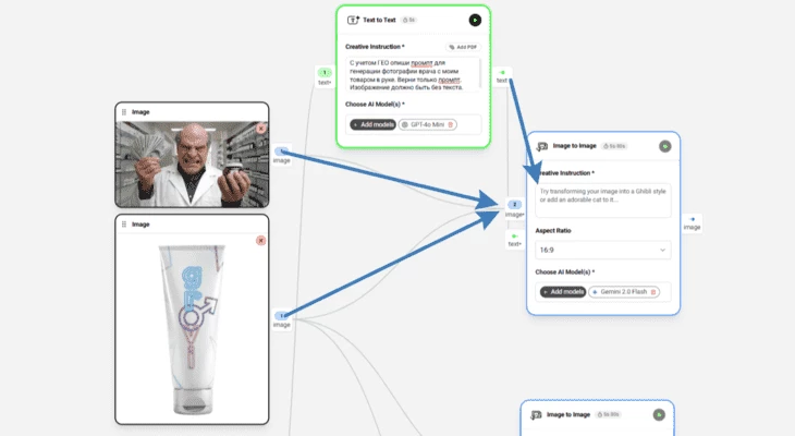 Перетащите «Image to Image» и свяжите его с фотографией оффера и узлом «Text to Text». Теперь img2img принимает промпт для генерации и картинку. Это все инструкции для AI. Никакие ТЗ вручную не указываем. Готово. Если замените первоначальные фото и описание, результат получится другой, но по заданному шаблону.