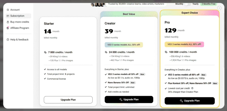 Подписка не дает анлим на все модели. Когда закончатся кредиты Opencreator, потребует обновиться. Для работы подходит тариф от $39.