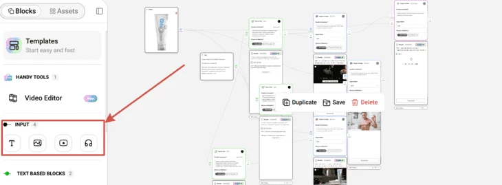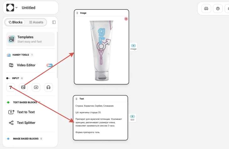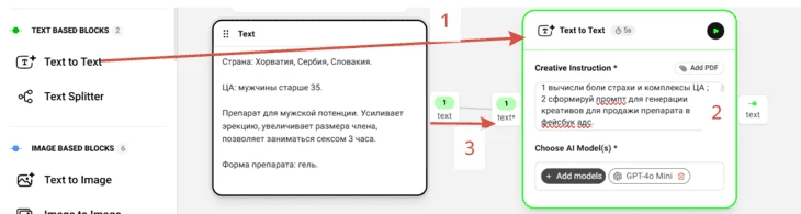 Теперь в рабочей области фото товара и ТЗ для формирования креатива. Если хотите генерить сразу разные подходы в крео, можно наплодить десяток блоков «Text to Text». Выходящая информация этого объекта пойдет в AI для рисования.