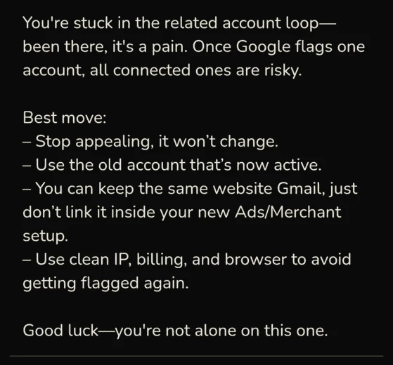 Если арбитражник столкнулся с этим циклом — аккаунт уже не спасти. Афф может хоть завалить офис Google Ads апелляциями, но это не сработает. Такой аккаунт можно выкидывать без лишних сожалений. Единственный способ защитить себя от этого цикла — полностью стереть любую связь с прошлым акком. Google Ads не скажет этого напрямую, просто продолжит указывать на некие «нарушения правил», но будьте уверены: под этим имеются в виду нарушения правил с прошлой учетной записи.