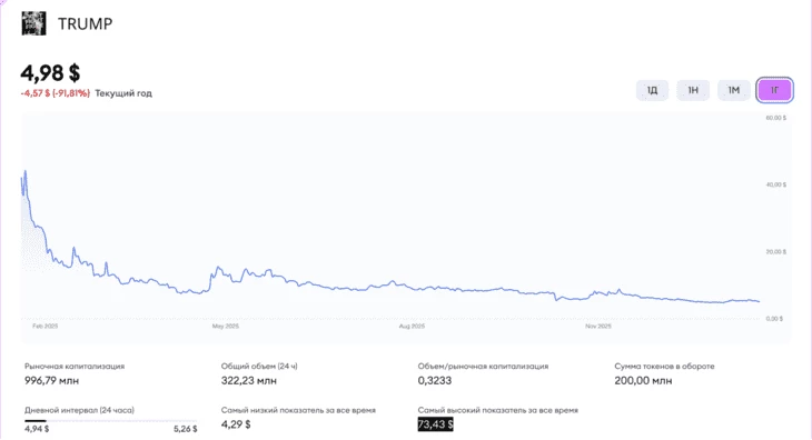 Однако спустя год эйфория сменилась разочарованием. Сегодня $TRUMP торгуется по $4,96, падение составило более 90% от исторического максимума. При этом рыночная капитализация токена все еще превышает $992 млн, согласно данным CoinMarketCap.