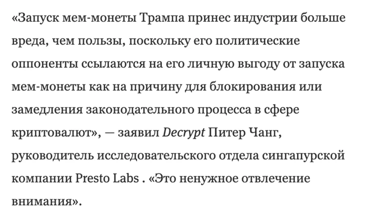Недавно Питер Чанг из Presto Labs дал комментарии издательству Decrypt, отметив, что запуск мем-монеты отвлек внимание законодателей и дал оппонентам удобный аргумент для затягивания регулирования крипторынка.