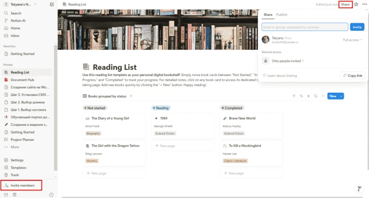 По умолчанию работа в Notion ведется в приватном режиме. Вы можете пригласить к работе своих коллег. Это можно сделать несколькими способами: