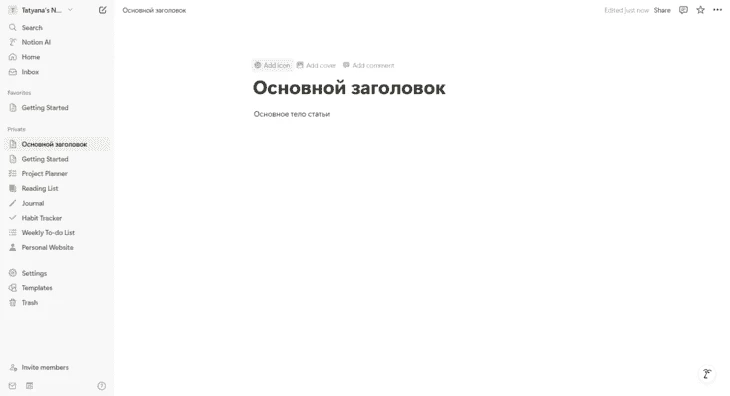 При создании новой страницы появляется пустой лист с плейсхолдером для заголовка и основным телом. Если навести курсор на тайтл, над ним появится небольшое меню с дополнительными функциями: добавить иконку, обложку или комментарий.