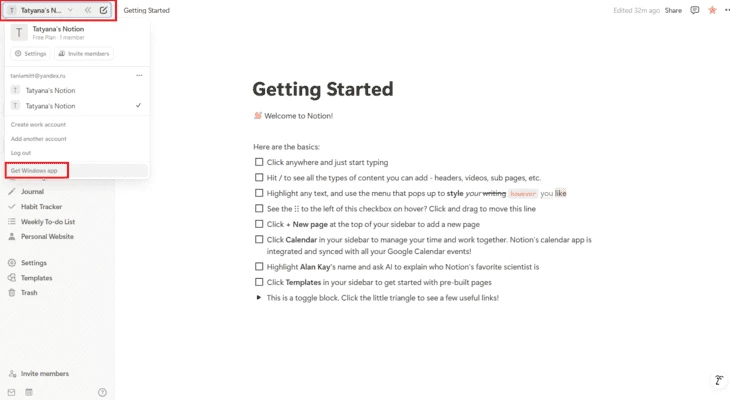 Теперь кратко рассмотрим десктопную версию notion, что это за программа. Чтобы ее скачать, после авторизации в верхней части экрана слева клините по своему нику. В окне меню выберите пункт Get Windows App.