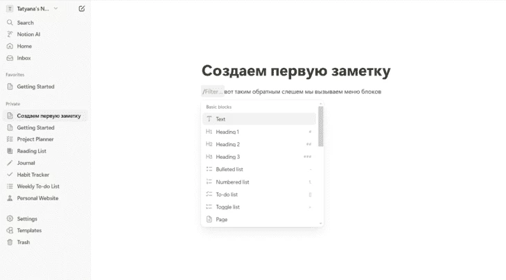 Чтобы начать печатать, кликните в любом месте страницы. Теперь рассмотрим подробнее, как работать в notion с наиболее популярными функциями сервиса.