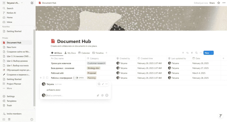 Одна из удобных функций Notion – возможность создавать и организовывать базы знаний. Их можно использовать как обучающий портал для сотрудников и даже создавать веб-курсы. Разрешается назначать права: сделать информацию полностью закрытой, открыть для всех желающих или выдать доступ только участникам команды.
