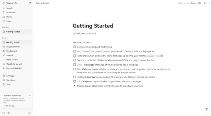 Интерфейс Notion предельно минималистичен – это позволяет пользователю сосредоточиться на работе. Сбоку слева находится панель навигации. В ней перечислены открытые страницы, избранное, основные инструменты.