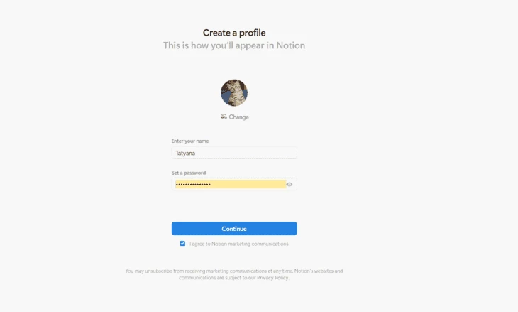Укажите имя и придумайте пароль. На этом шаге также можно добавить фотографию. Отметьте галочкой пункт согласия с правилами и нажмите Continue.