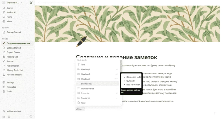 Notion работает по принципу конструктора: страница составляется из блоков. В библиотеке сервиса более 100 элементов, которые можно комбинировать на одном листе-макете.
