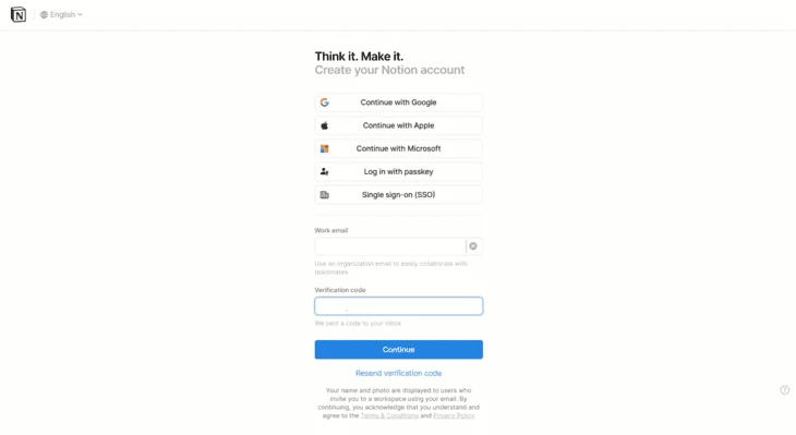 Сервис предложит несколько вариантов входа: через личную или корпоративную почту, Google, Apple и Microsoft, SSO. Когда вы выберете подходящий вариант, Notion отправит на привязанный e-mail код для входа.