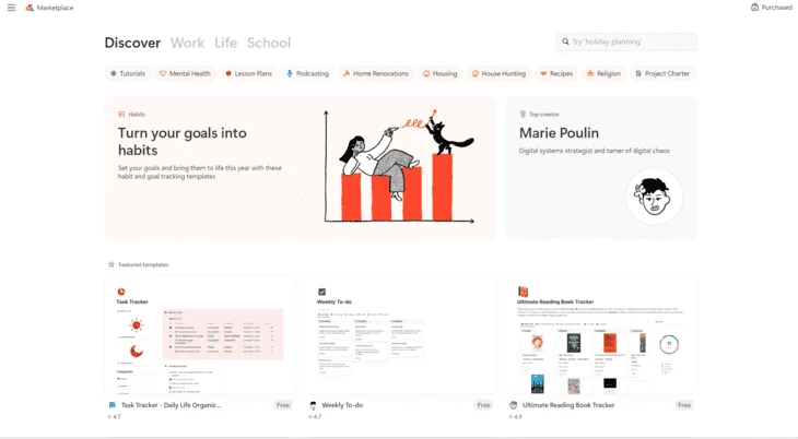 Для быстрого старта Notion предлагает готовые шаблоны. В коллекции есть странички с наполнением для разного типа дел – отслеживание здоровья, составление контент-плана, рецепты, бюджет, списки целей и т. д.