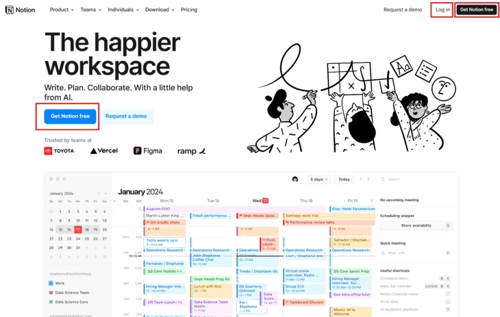 Откройте главную страницу и отыщите кнопку Log in. Создать аккаунт также можно с помощью кнопок Get Notion free в правом верхнем углу или на главном слайдере.