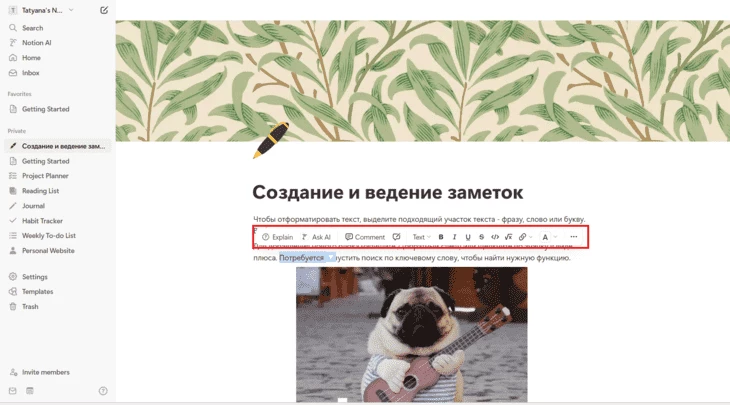 Текст на странице можно форматировать в свободном режиме. Для этого выделите нужный отрывок текста. Появится небольшое горизонтальное меню со всеми доступными стилями.