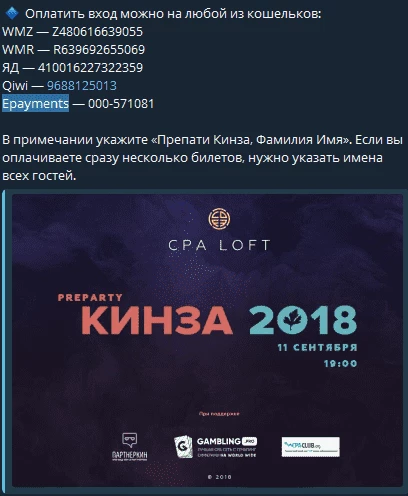 До сих пор можно найти рекламу препати KINZA 2018, где предлагают оплатить вход на кошелек в этой платежке.