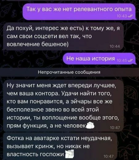 Недавно кандидат, которому я вежливо отказала, ответил, что «айчары бесполезны» и даже докопался до моей аватарки. Такое тоже бывает.