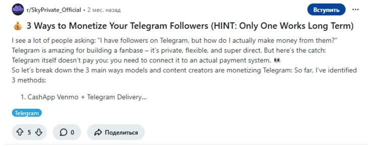 При этом площадка часто делится советами по дополнительной монетизации, например в Телеграме.