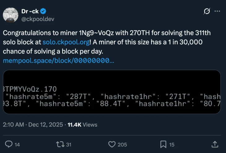 «Поздравляем майнера 1Ng9~VoQz с 270TH за решение 311-го соло-блока на Ckpool! У майнера с такими показателями шанс на добычу блока составляет 1 к 30 000 в день», — написал в посте Х администратор пула Кон Коливас.