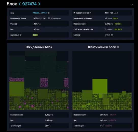 11 декабря соло-майнер добыл 3,13 BTC, что на момент нахождения блока эквивалентно примерно $284 000. По оценке аналитиков The Block, подобное везение можно считать исключительным: в среднем такие случаи происходят примерно раз в 82 года.