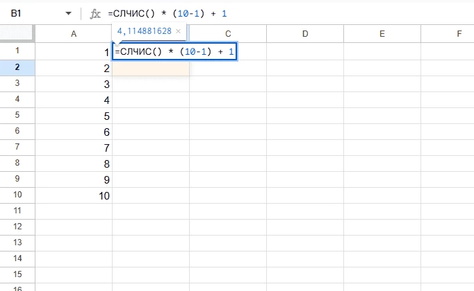 - В любой свободной клетке напишите «=СЛЧИС() * (b-a) + a». Вместо буквы «А» поставьте нижнюю границу диапазона, например, 1, а вместо «B» верхнюю границу в зависимости от числа пользователей.