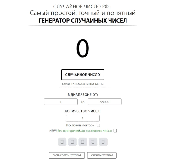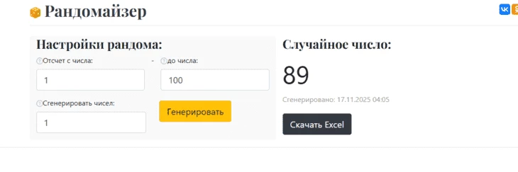 Рандомус ru –– это популярный генератор чисел случайных для розыгрыша онлайн, который специализируется на генерации случайных значений. Его можно использовать для проведения розыгрышей где угодно, например, в Instagram.