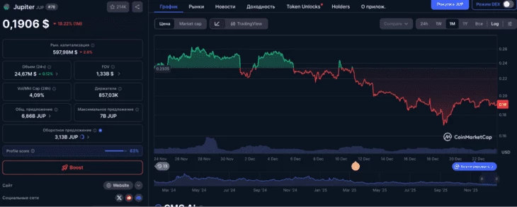 На пике цены после аирдропа, 27 января, стоимость этих токенов составляла около $791 млн, исходя из цены в $1,13 за $JUP. Это меньше, чем в прошлом году, когда протокол выпустил 1 млрд токенов $JUP на сумму $2 млрд по рекордно высокой цене Jupiter в $2 31 января 2024 года. На момент написания статьи, 23 декабря 2025 года, стоимость токена составила $0,1906, что означает падение после январского аирдропа на 83%.