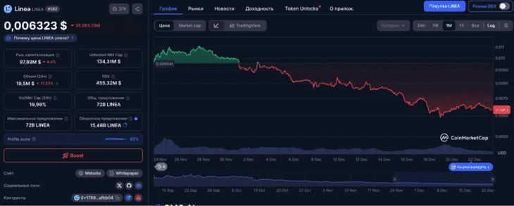 В конечном итоге еще 75% от общего объема токенов будет зарезервировано для участников сети на ближайшие годы, однако $LINEA упала примерно на 86% от своего пика. На момент написания статьи, 23 декабря, цена токена составляла около $0,0063.