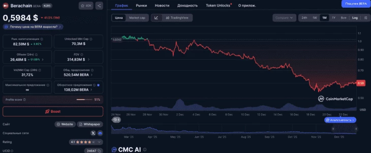 На пике своего развития стоимость токенов превышала $1,17 млрд, исходя из исторического максимума в $14,83 за токен $BERA. К сожалению, для держателей токенов $BERA исторический максимум цены токена был достигнут сразу после запуска, и с тех пор он практически не менялся, упав почти на 96% с февраля и достигнув отметки в $0,59 по состоянию на 23 декабря.