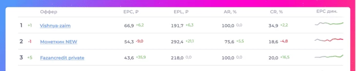 Динамика — обращай внимание на офферы, которые поднялись на 5 позиций и более. Если оффер стабильно растет в топе несколько недель, это хороший знак – рекламодатель увеличил объем выдач.