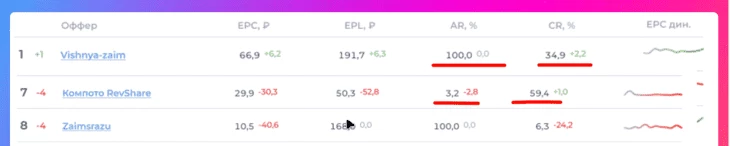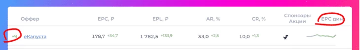 Смотри на графу "EPC дин." — это изменение EPC за неделю. Если оффер резко вырос, значит, там что-то случилось: улучшили условия, дали повышенные ставки или просто нашли работающую связку. У тебя есть шанс заскочить в этот поезд.