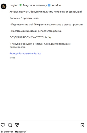 Механика однотипна: у жены пропали деньги, а на самом деле их проиграл муж. Также автор обещает купить новым подписчикам бонуски, если те перейдут в его Телегу.
