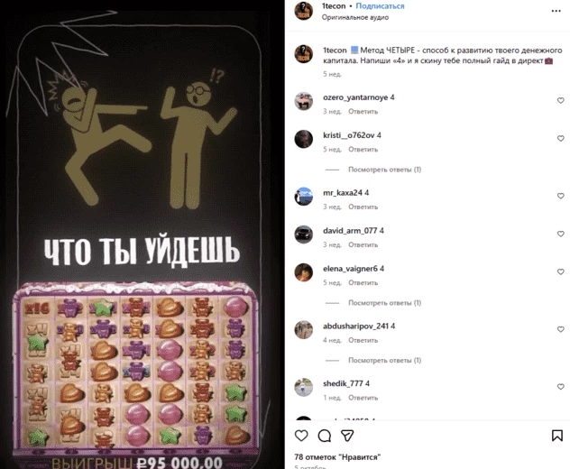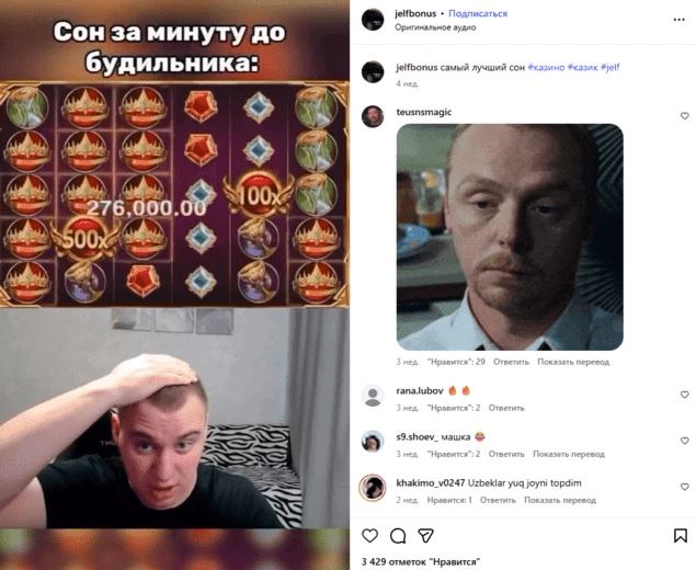 Привычные подходы в креативах уже не дают должного результата, поскольку у пользователей выработалась баннерная слепота и просто красивыми картинками с большими цифрами их не удивить. Поэтому в соцсетях, а особенно в Инстаграме*, на широкую аудиторию вирусятся UGC-креативы под iGaming, где пользователи не используют дизайнеров или специальные навыки, а просто снимают смешные видео про казино, получают широкие охваты и переводят прогретых юзеров в Телеграм или непосредственно на ленд.