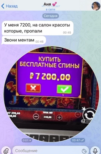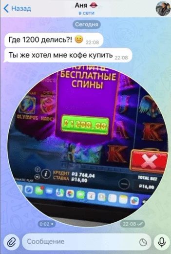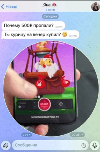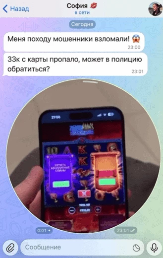 Здесь у девушки «украли» 7200 рублей, но на самом деле муж залил их в слот от Pragmatic Play. Флоу простой: нужно просто сымитировать переписку, а после записать на кружок, как ты покупаешь бонуску на соответствующую сумму.