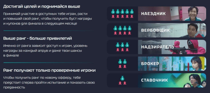 В процессе игры ты повышаешь свой ранг. Это важный элемент, потому что чем выше твой ранг, тем больше ты получаешь наград за каждый апрув и открываешь доступ к более выгодным офферам и бонусам. - ТОП-100
